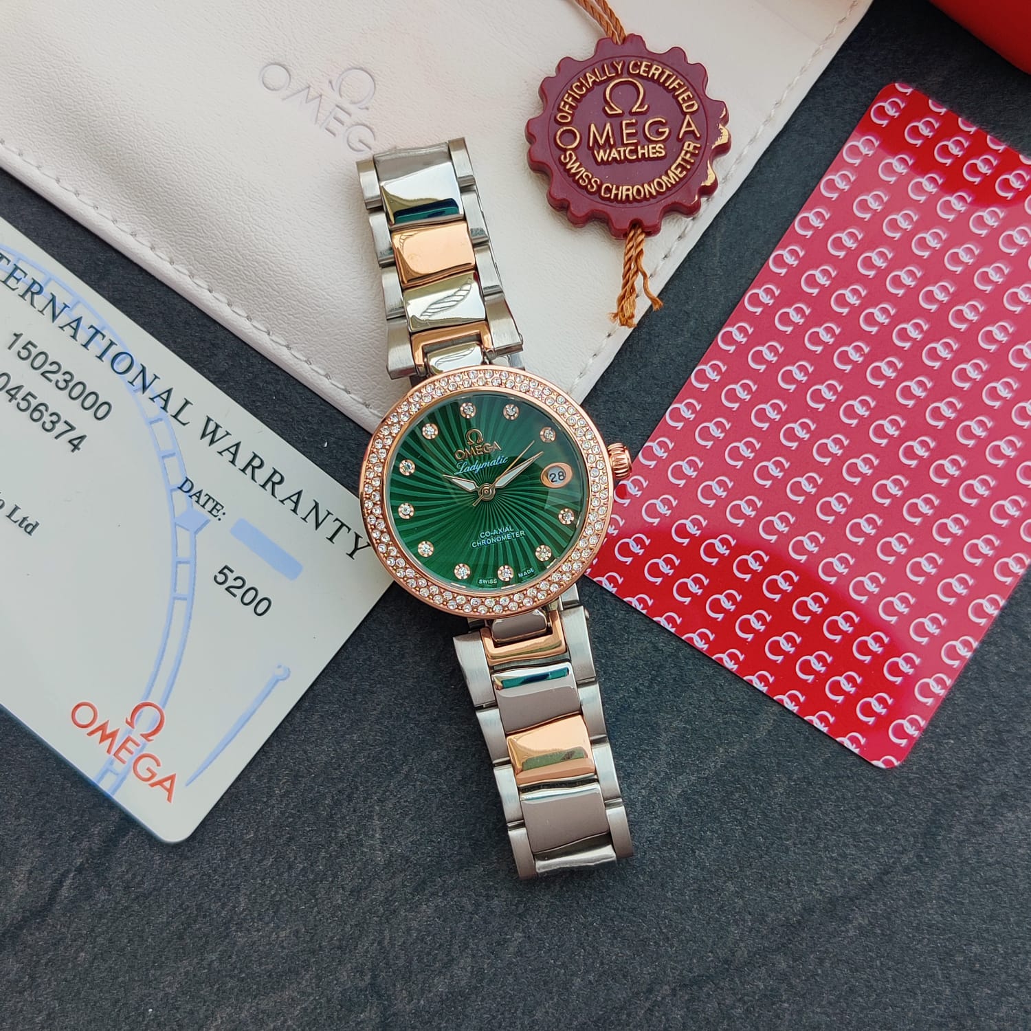 Omega Ladymatic Rosegold and Rosegold alpha shape strap with beautiful dials are available & Ready to ship today.